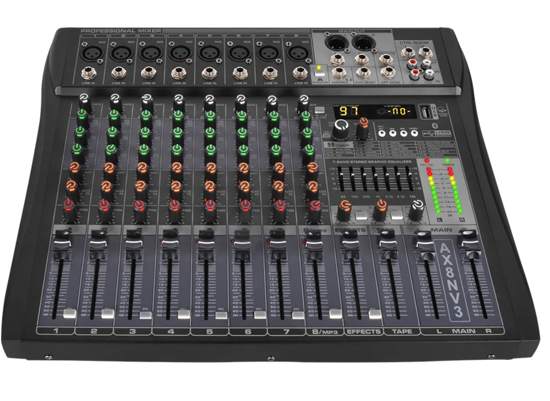 8개 채널 스트립은 각각 하단에서 상단으로 다음의 요소들이 있 다. 마이크와 라인에 대한 30dB 패드의 인 아웃 버튼; 44dB 로터리 트림 포트(pot) : 콘솔 후면에 있는 마이크 라인 입력이나 테이프 입 력을 선택하는 테이프 셀렉터; 4개의 이퀄라이저 컨트롤; 과부하 LED; 폴드 백 레벨 컨트롤; 테이프 설렉터 스위치; 효과 레벨 컨트롤: 4개 프로그램 채널에 대한 2개 프로그램 채널 할당 버튼; 팬 포 트(panpot) : 프리페이더 리슨(PFL) 스위치: 입력 채널 페이더 등 을 말한다.